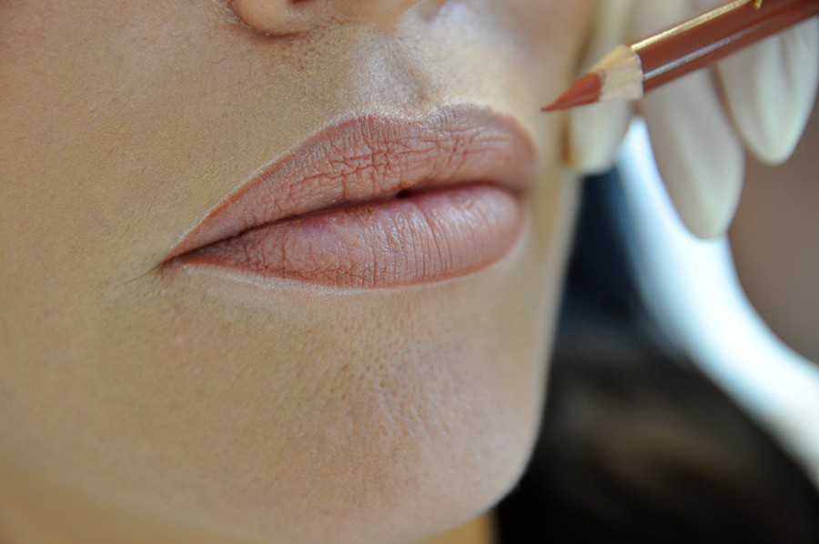 Hier wird im Herzbereich der Oberlippe gezeichnet. Die Lippenform wird durch eine Liplight-Zeichnung plastischer. Verwendet werden dazu Camouflage-Pigmente.
